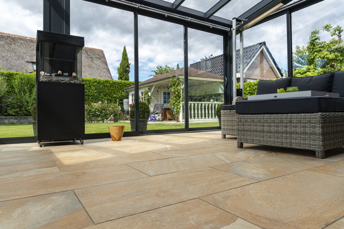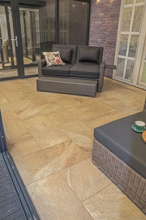 Keramische tegel met een betonnen onderbouw. Met 2mm afstandshouders.
