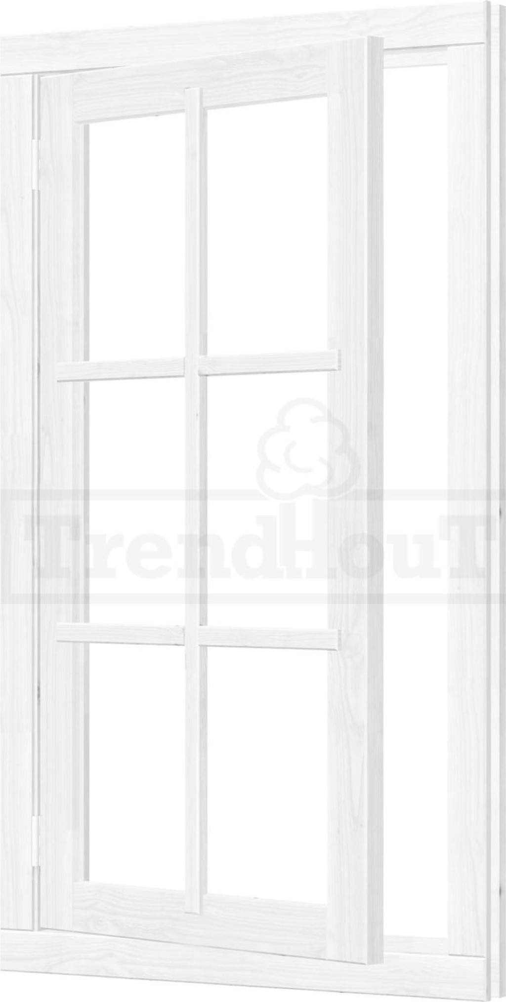 Dit witte vleugelraam is linksdraaiend, inclusief losse voorzetroedes, enkel glas en hang- en sluitwerk.