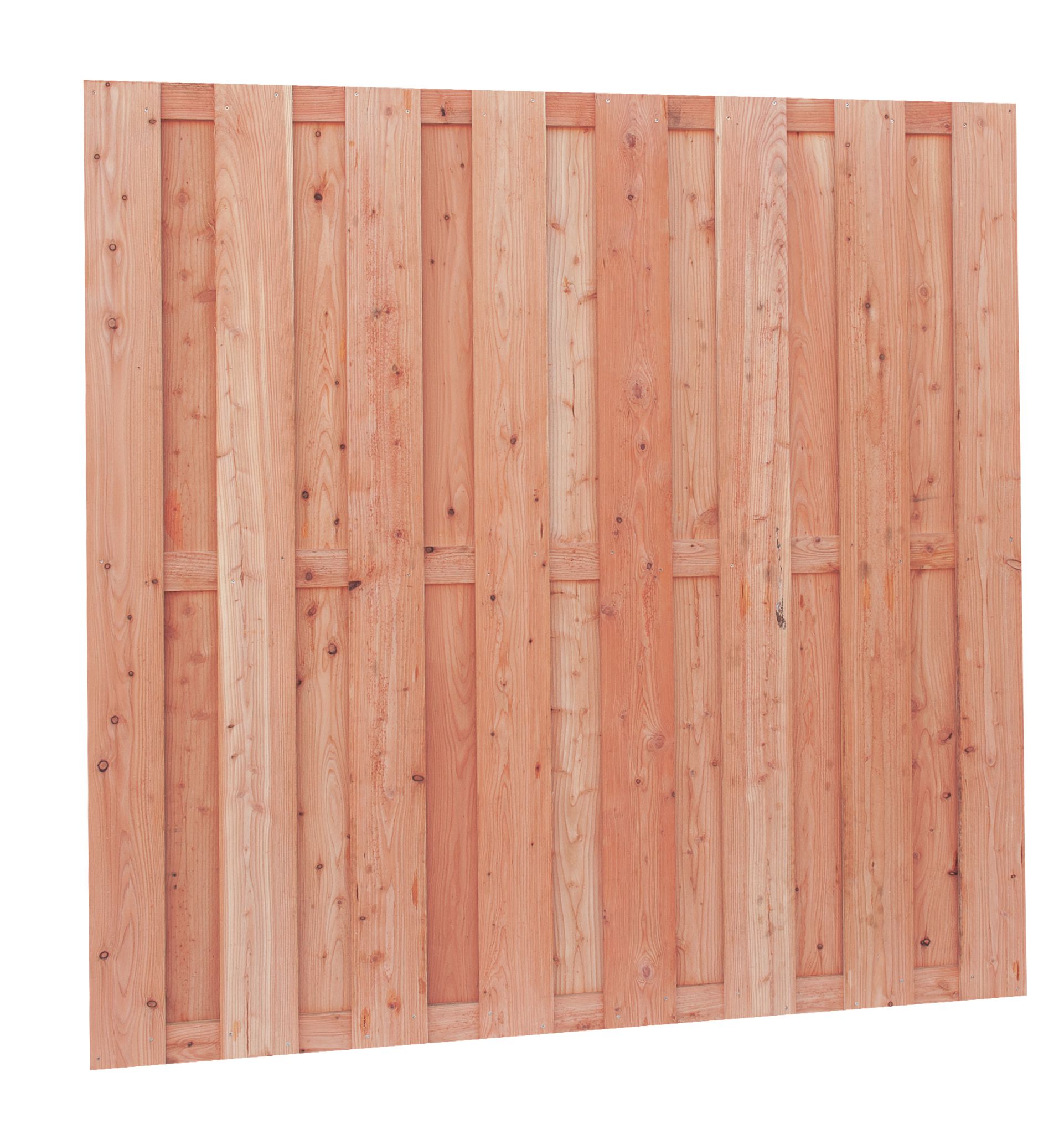 Recht verticaal. Planken 1,5x14 cm. 15 planken, 3 tussenplanken. Ook horizontaal toepasbaar. Douglashout valt in duurzaamheidsklasse 3 en is daarmee één van de duurzaamste houtsoorten in Europa.