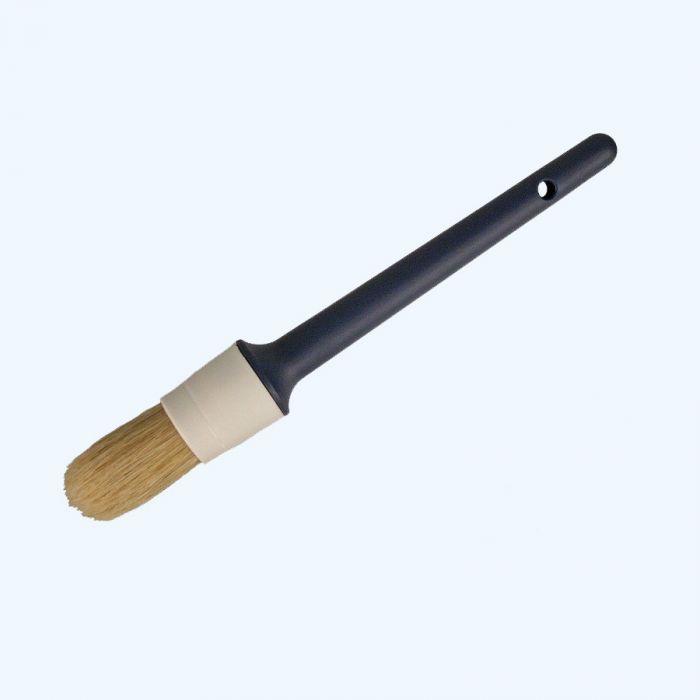 Ronde kwast met een kunststof steel en wit varkenshaar, geschikt voor synthetische grond- en aflakken.
