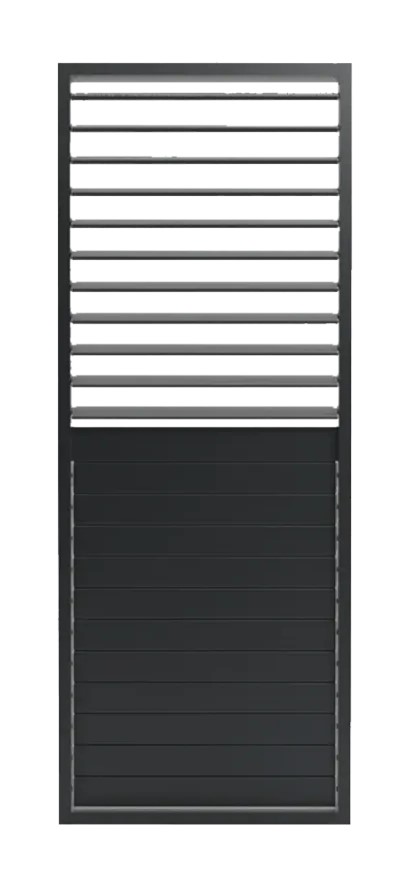 Vanaf een hoogte van 1,5 meter kan het paneel in twee delen afzonderlijk worden gedraaid, met een vaste lamel tussen de delen. Dit systeem is gemaakt van hoogwaardige materialen, zoals dikwandig aluminium, voor een duurzame en stijlvolle uitstraling.