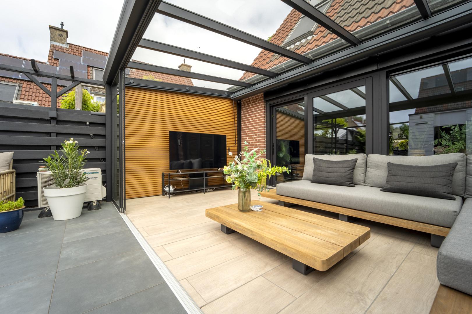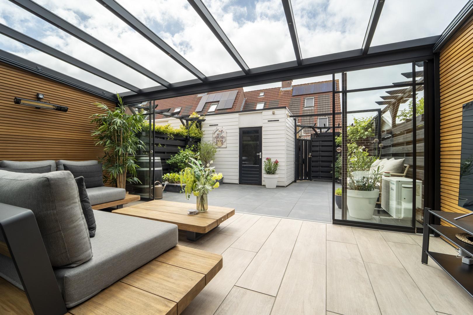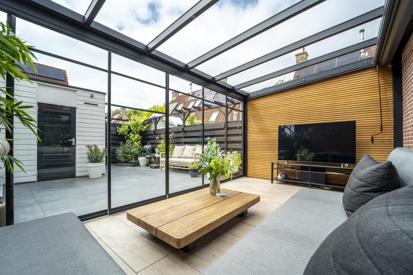 De glazen schuifwanden maken het mogelijk om de tuin echt te betrekken bij de overkapping: open en veel natuurlijk licht bij mooi weer, afgesloten en beschut als het frisser wordt. De steellook accenten op de glaswanden zorgen voor een luxe touch.