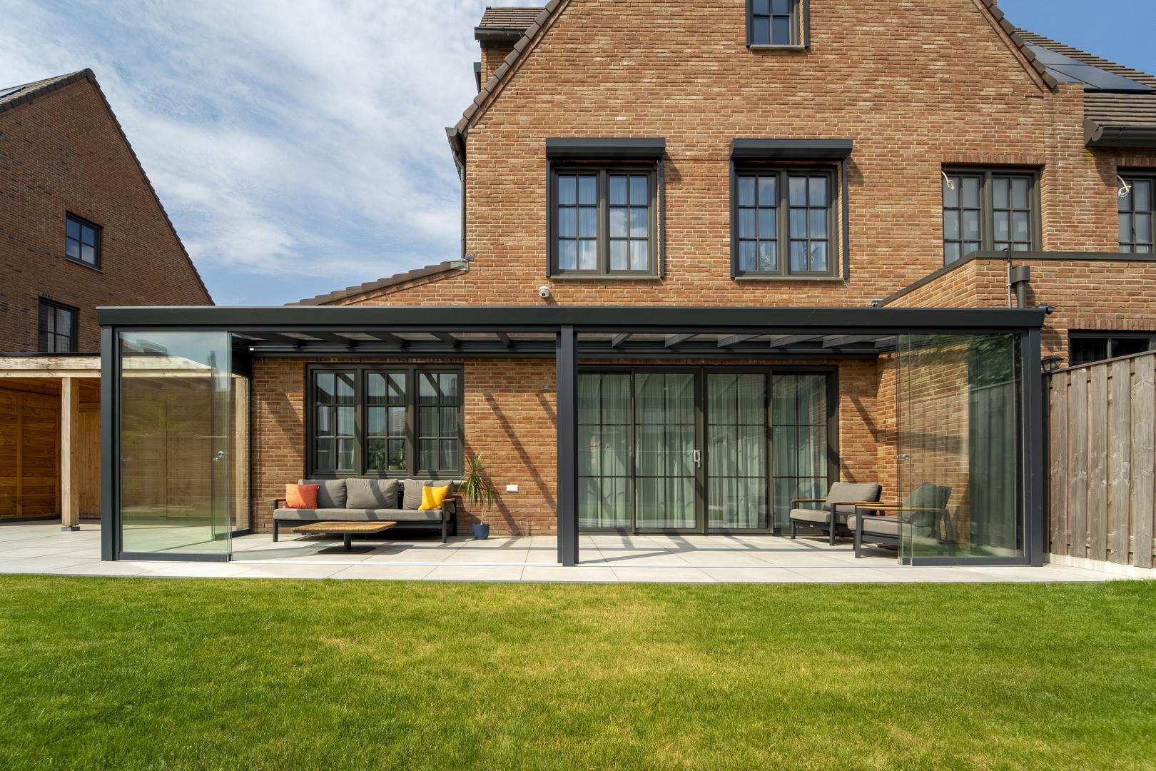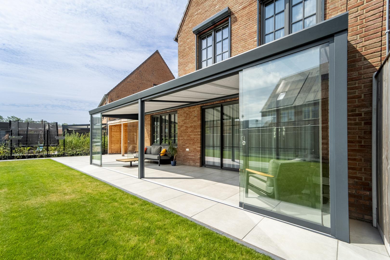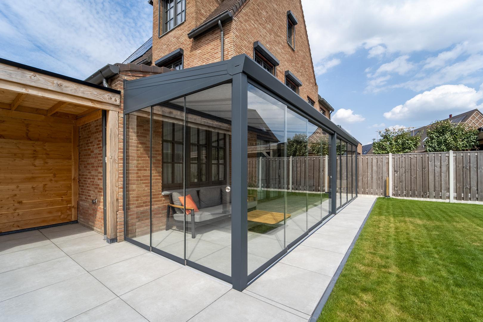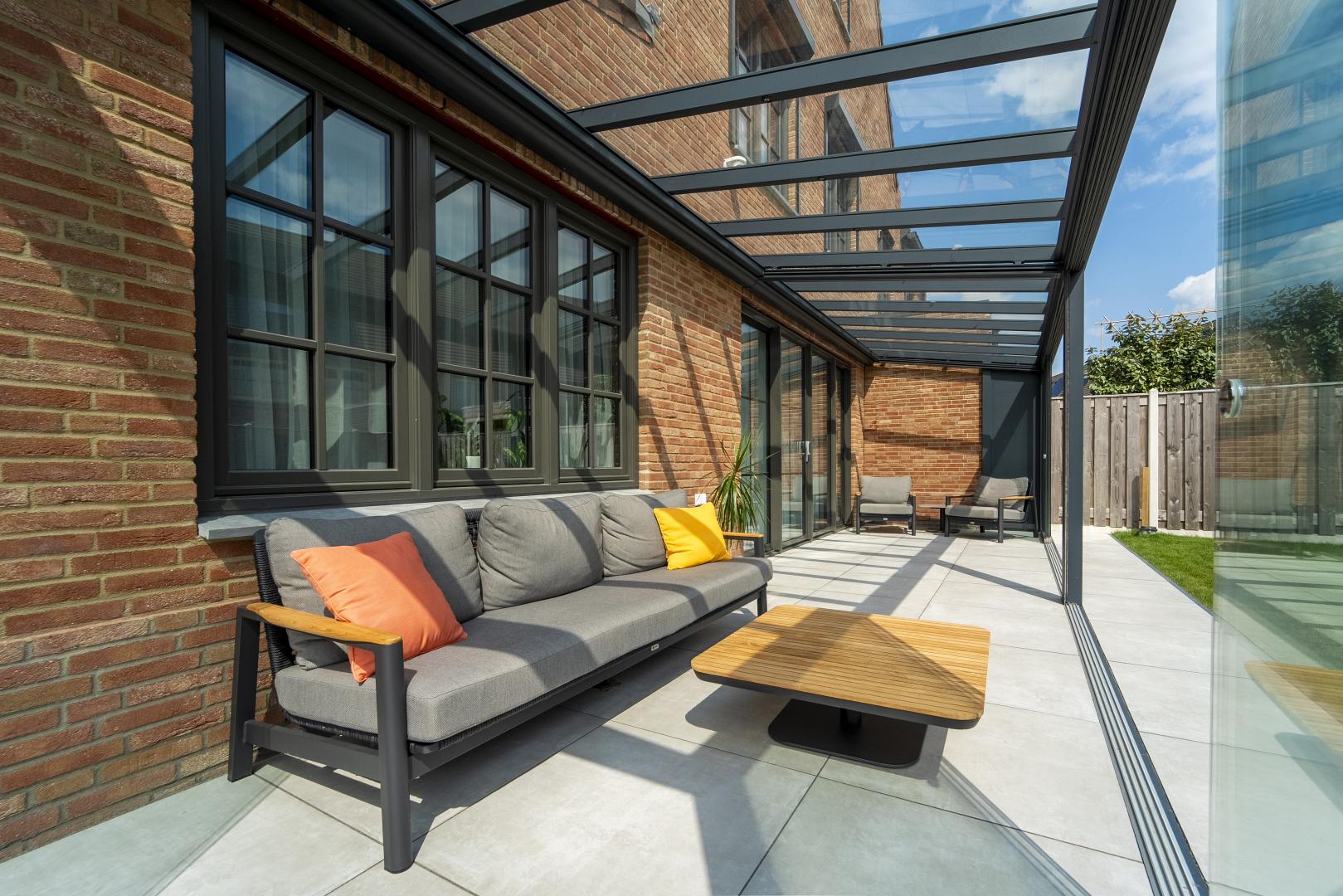 Met deze aluminium Trendline terrasoverkapping van 9m breed, haal je maximaal comfort uit je tuin. De glazen schuifwanden zorgen voor een flexibele, open ruimte die je het hele jaar door kunt gebruiken.