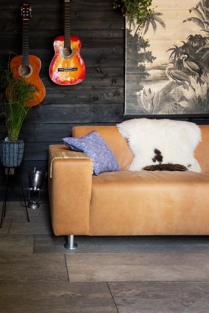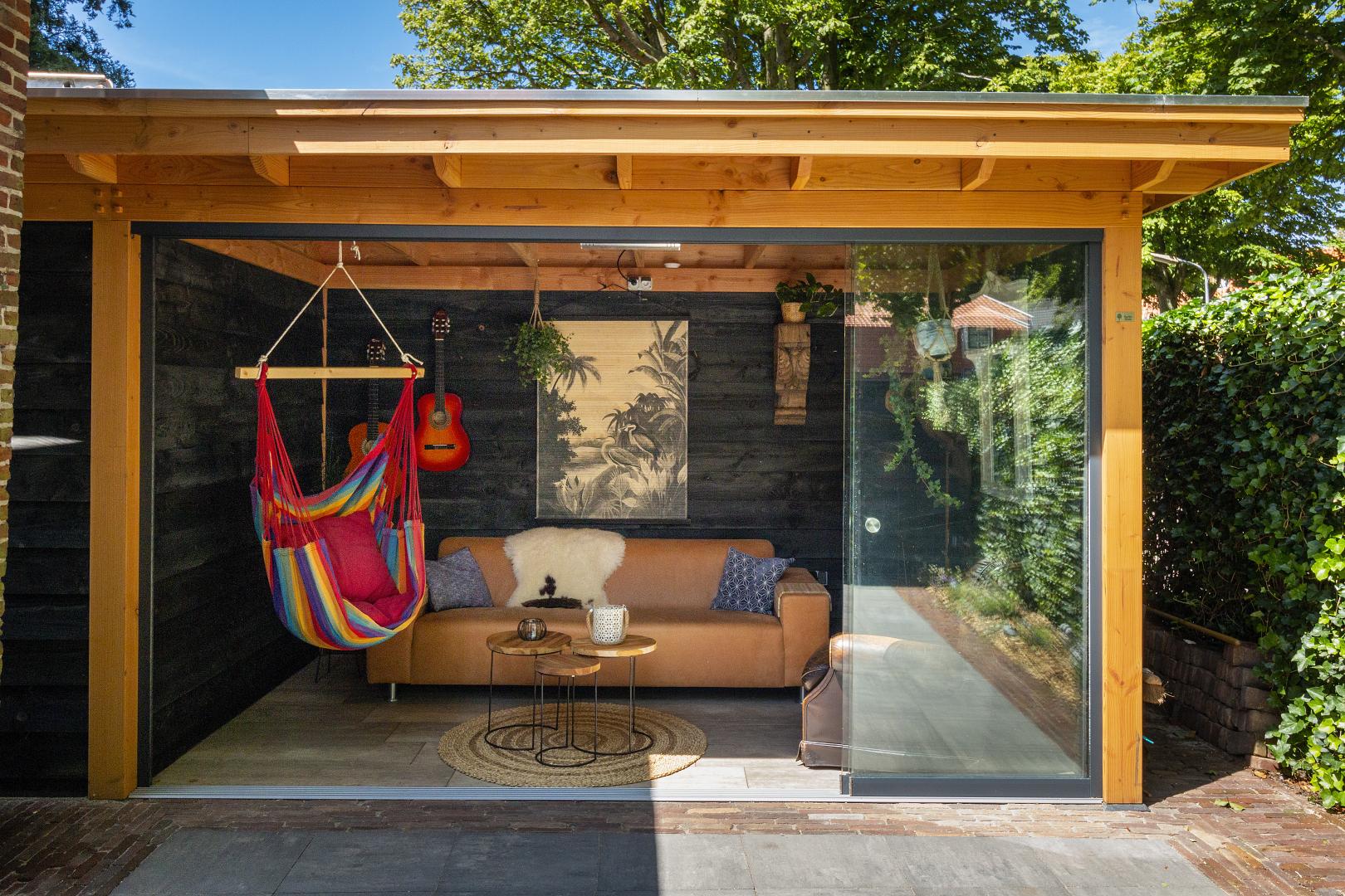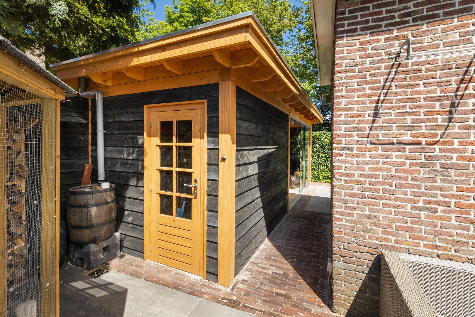 Aan de overkapping vast is een schuur gebouwd in dezelfde stijl, waardoor praktische opbergruimte naadloos samengaat met het design van de tuinkamer.