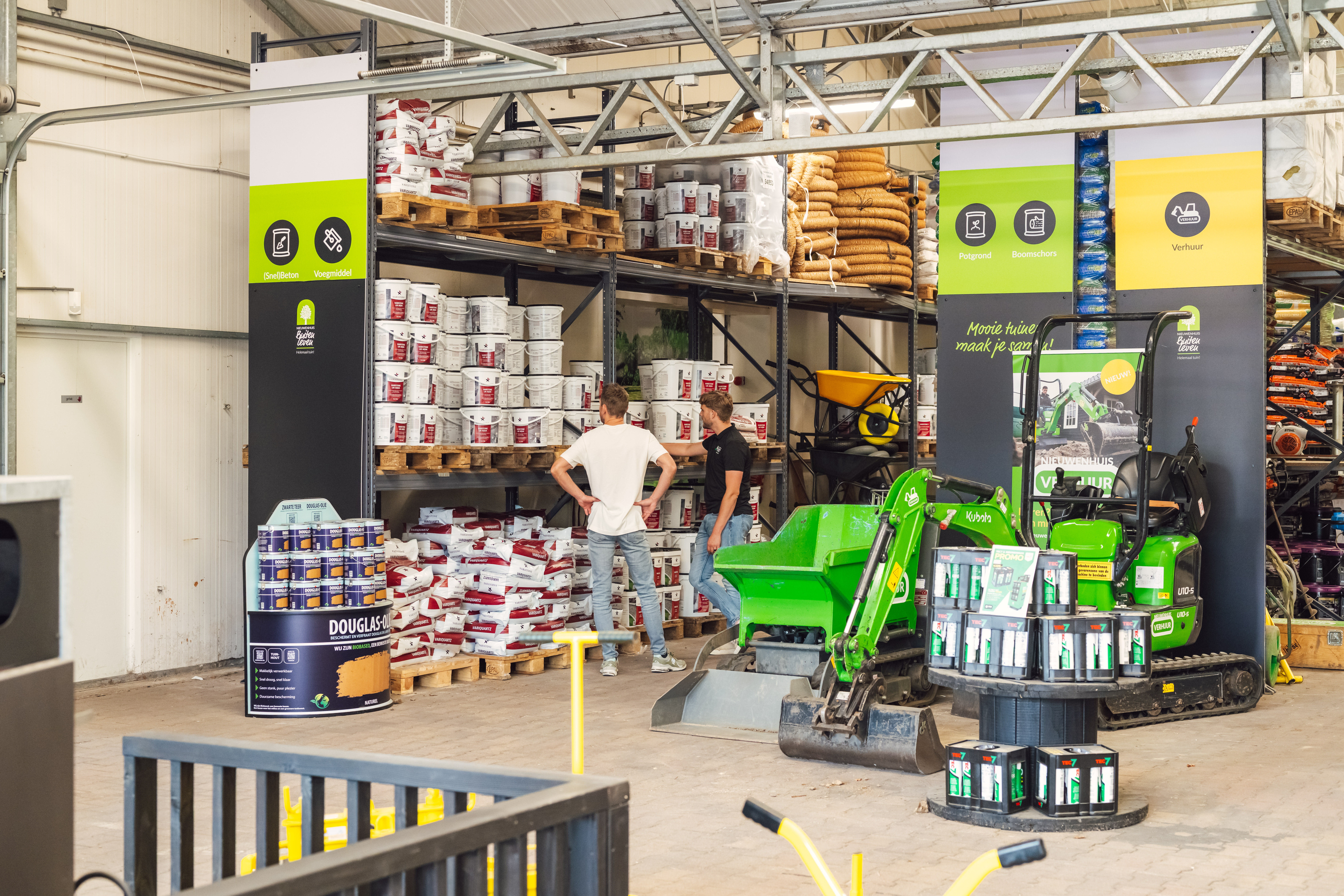 Op ons ruime buitenterrein staat onze voorraad uitgestald. Bestrating, grind en zand zijn buiten te vinden en alle houtproducten staan netjes op stellingen in onze houtloods. Het logistiek team zet de bestellingen klaar en de chauffeur bezorgd de materialen op locatie bij de klant thuis.